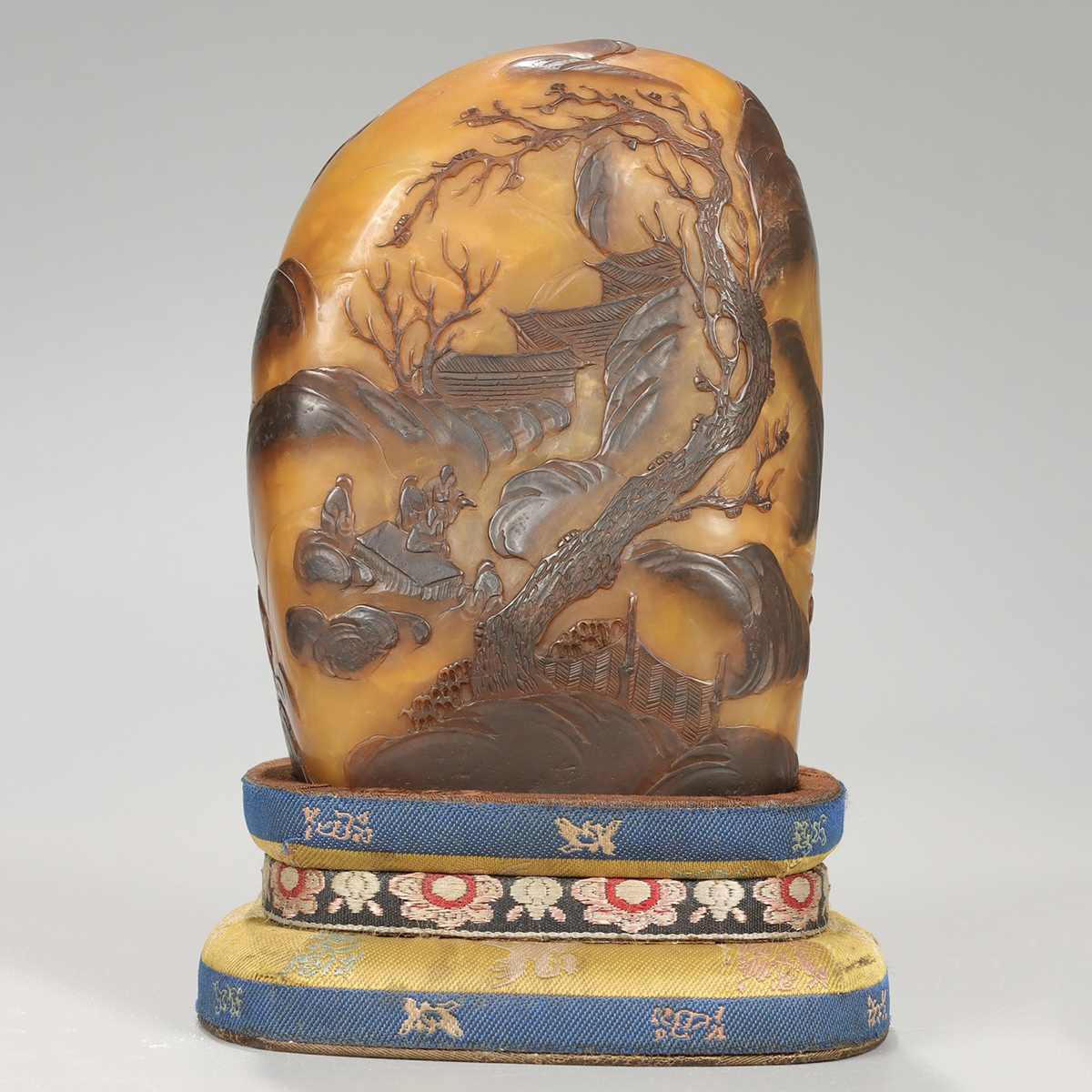 - ▽鴻▽清時代 清卿銘 寿山石 烏鴉皮田黄石彫 高士雅聚図山型置物 共箱 時代物 中国古美術 骨董品