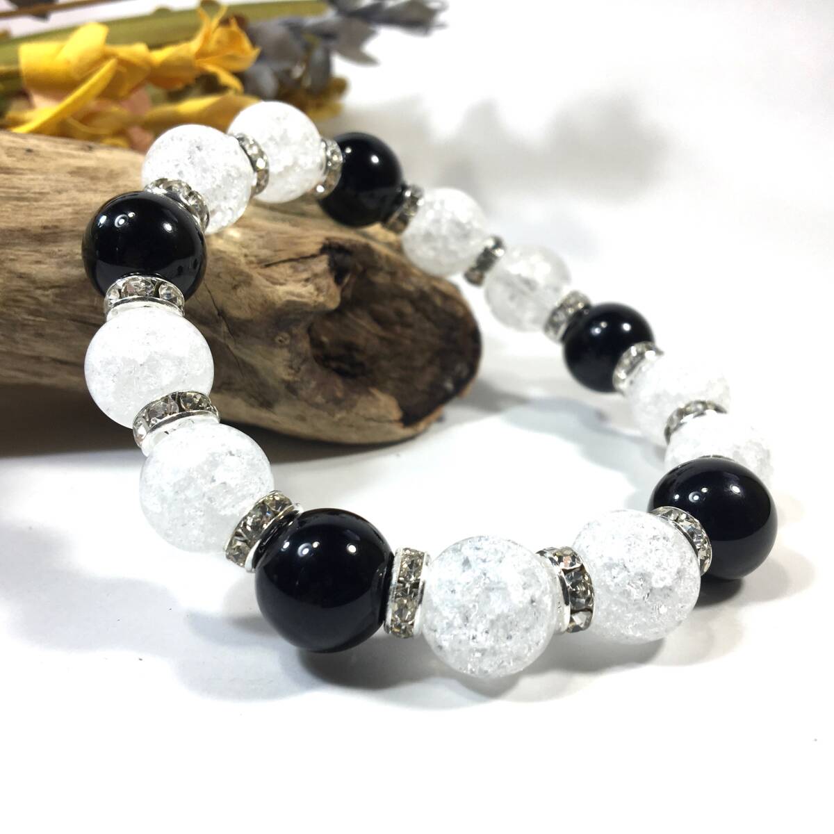 - クラック水晶&オニキス パワーストーン ブレスレット (シルバー) 12mm 幸運 開運 メンズ 男性♪
