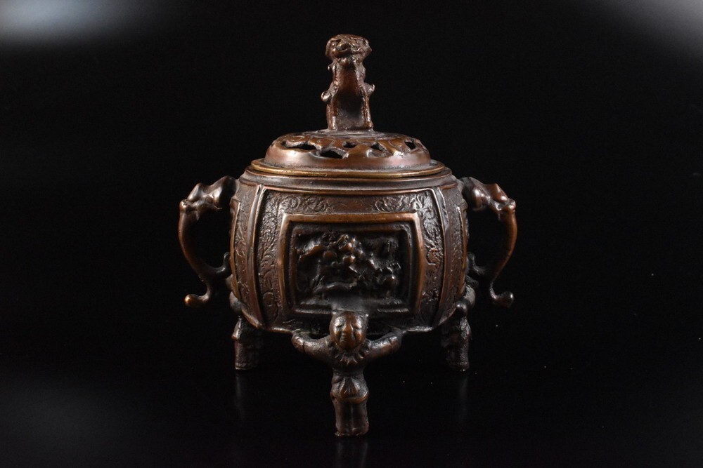 - 【雲】某資産家買取品 銅製 花 人物彫刻 獅子香炉 古美術品(香道具旧家蔵出) F8547