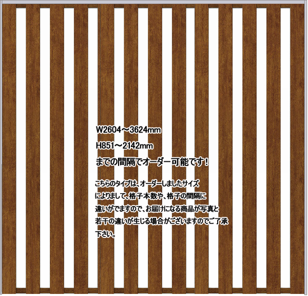 | 商品紹介 | ○ アルミ 可動間仕切り スクリーンパーテーション ○ 商品のサイズはお客様が取付致します、ご希望のサイズに合わせてお届け致します ○ アルミカラーは(ウォールナット)となります ○ パネル部分は、安全なアクリル樹脂製(透明)4mm厚 ○ 取付部は上吊りでバリアフリーにも対応 ○ アルミ3方枠が標準にて付属致します ○ こちらのタイプは、オーダー頂きましたサイズによりまして、格子本数や、格子の間隔に 違いがありますので、ご了承下さい。 ★ オプションにて、ガイドレール、ソフトクローズ機能を追加可能です ★ キッチンとダイニングとの間仕切りや、広いリビングを機能的に間仕切る等、デザインを損なわずにお使いいただくことが可能です ★ 寝室や、子供室等の本格的な入口戸には、若干不向きな点がございますので、お使い頂く場所で、お悩みのお客様はお気軽にご相談下さい |
