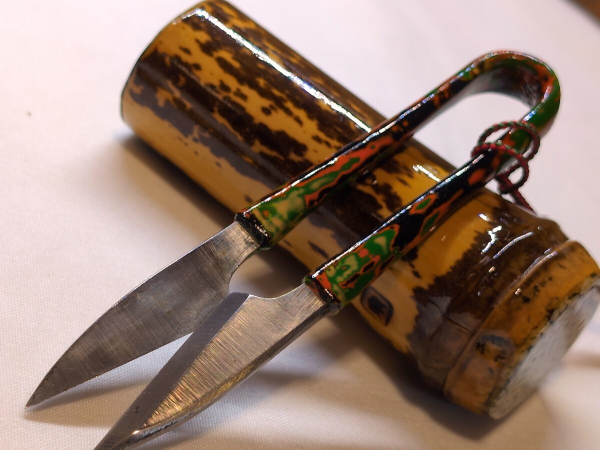 - ◆優美◆鮫革装飾◆虎斑竹の鋏立て◆研ぎ出し和鋏付き 黒柿へら鮒木札 ●ワレあり●