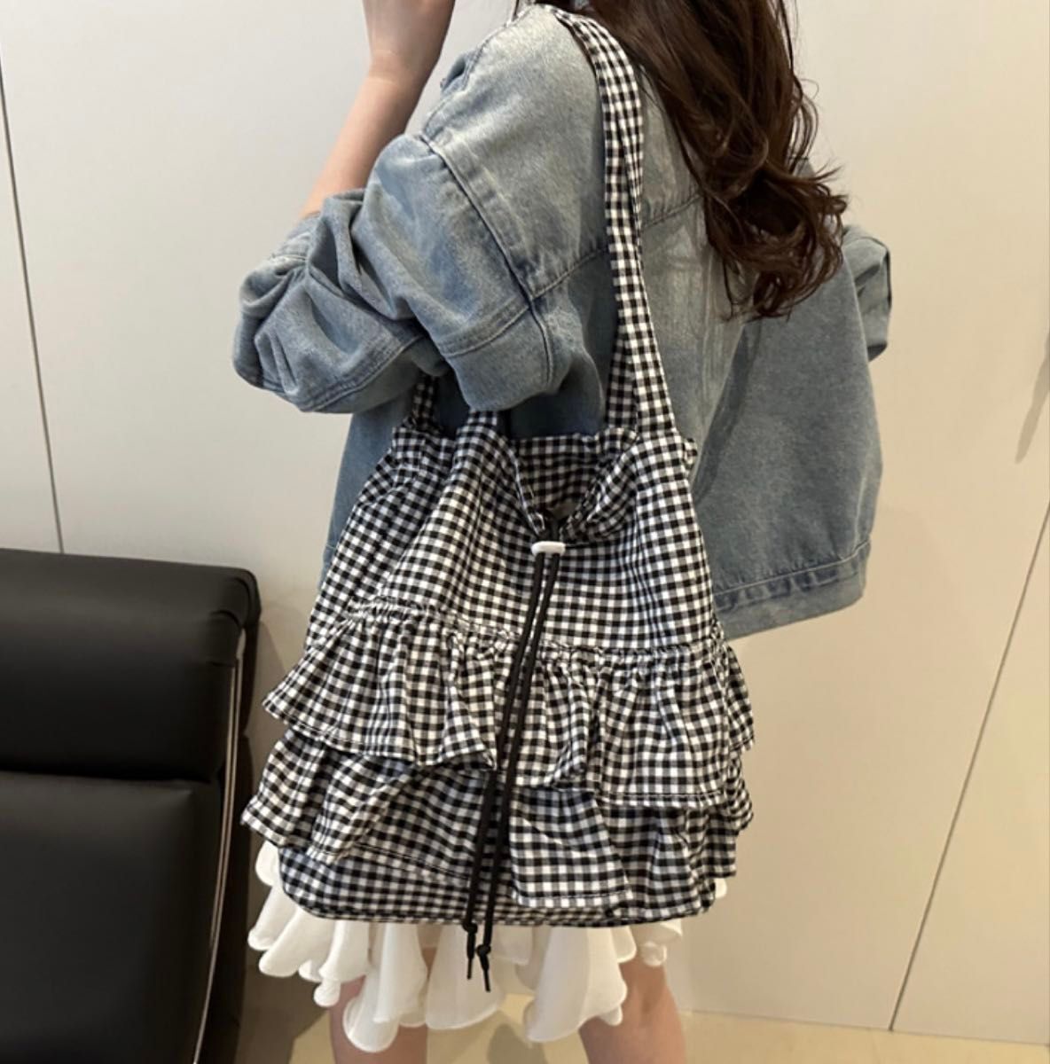 - 新品未使用 ギンガムチェックトートバッグ フリル ブラック 黒 マザーズバッグ