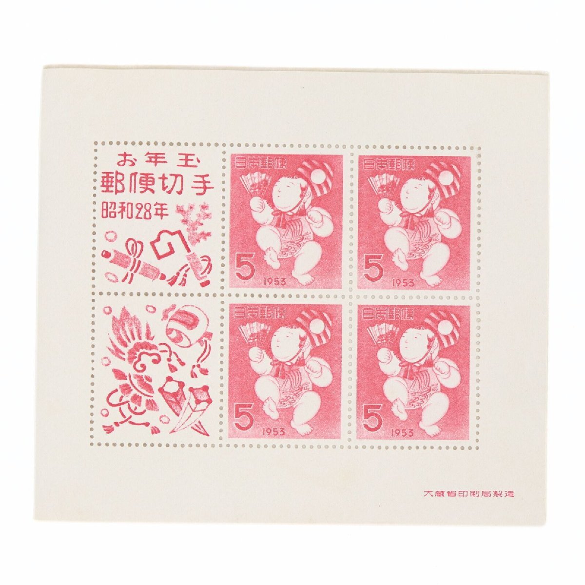 > 12838-O-送料無料 お年玉郵便切手 年賀切手 昭和28年 三番曳人形 5円 小型シート 未使用