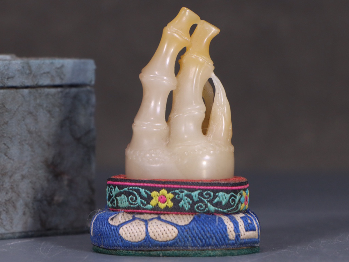 - ▽鴻▽清朝時代 寿山石 芙蓉石彫 竹節鈕印章 牧甫作 箱付 時代物 中国古美術 骨董品