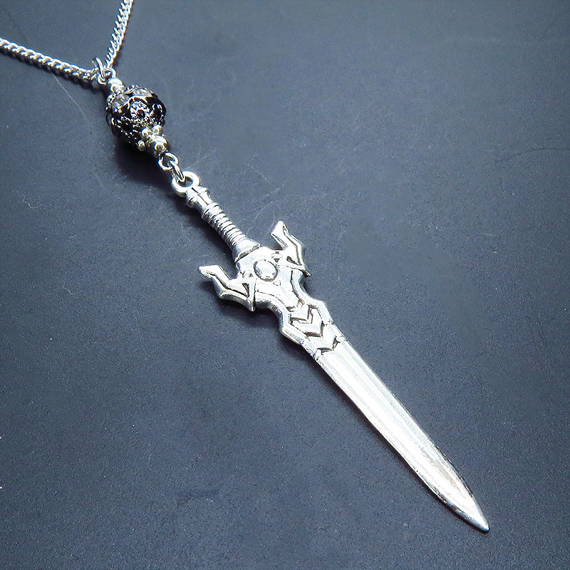 > アンティークシルバー 両刃剣(ソード)モチーフとブラックカラーメタルビーズのネックレス ラインストーン 長さ調整可 アジャスター可