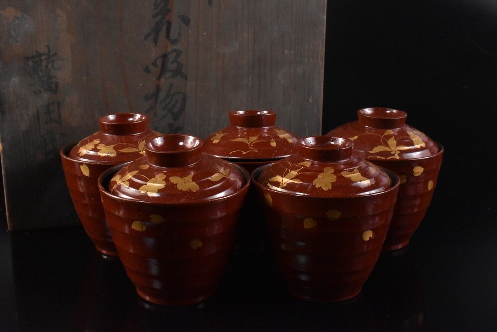 - 【雲】某老舗旅館買取品 木製 漆器 吸物椀 5客 共箱 古美術品(懐石料理道具吸物椀) F8558