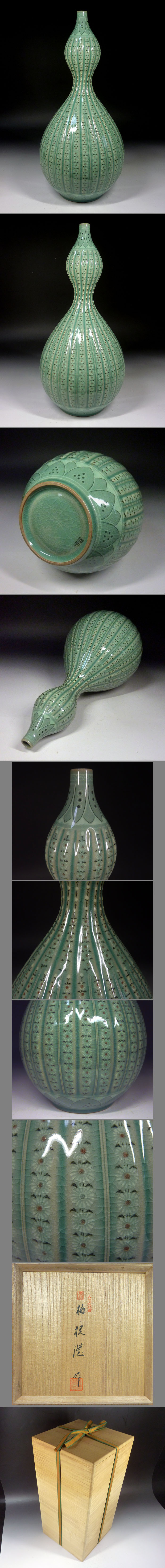 - 【陶酔】 ★韓国陶芸★ 柳 海剛 高麗青磁象嵌花文花瓶 36.0cm