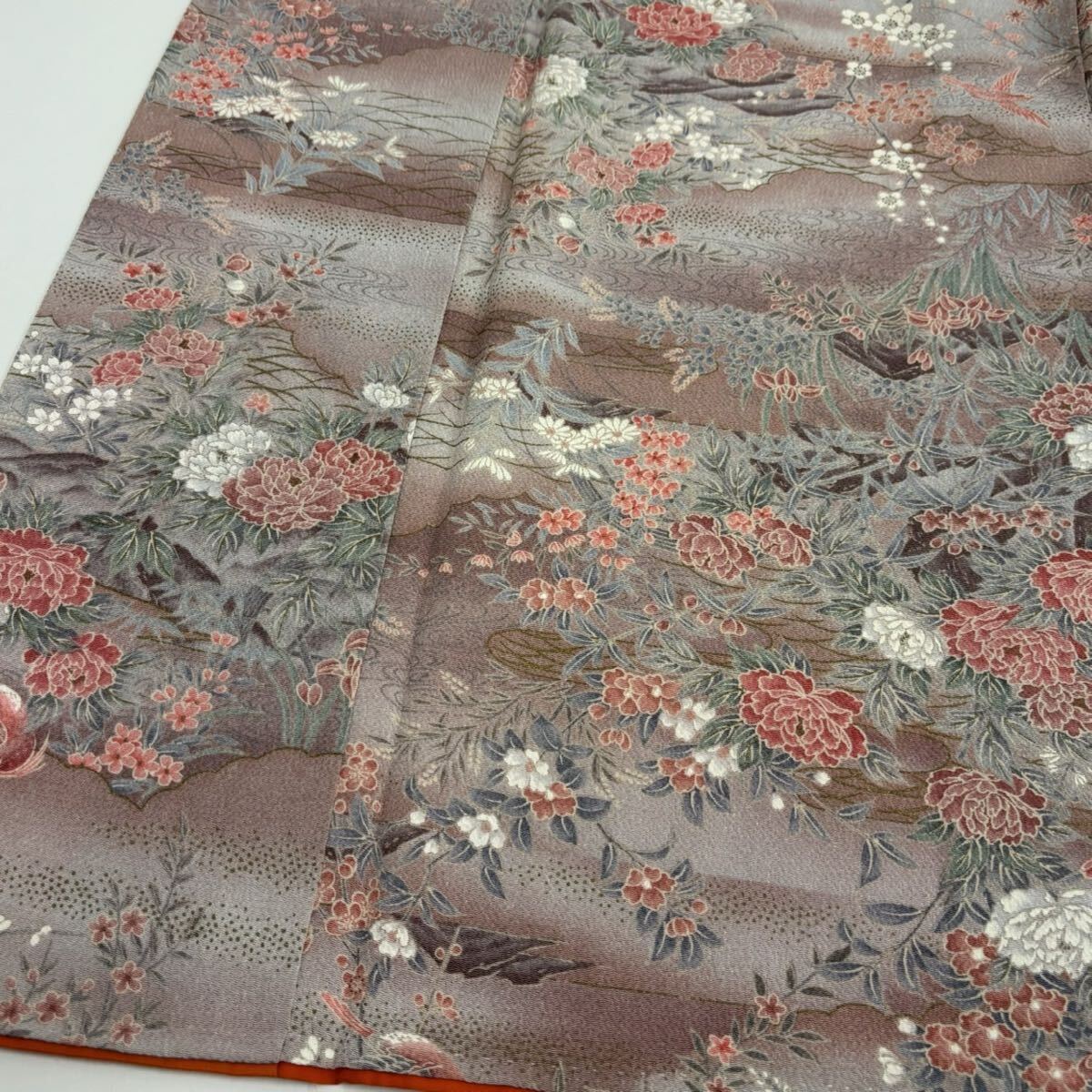 - 小紋 裄66 美しい草花の染め ちりめん 着物 正絹 W-5371