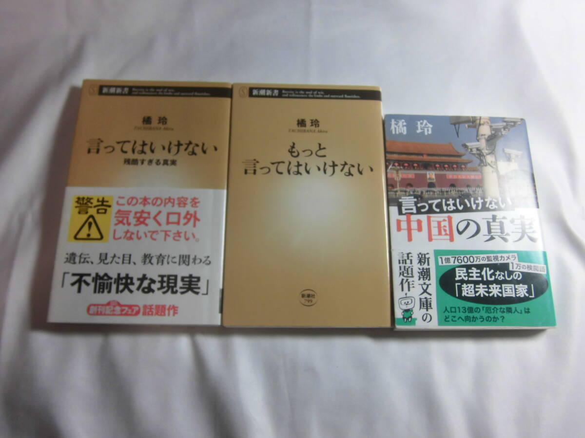 「言ってはいけない 残酷すぎる真実」橘 玲(著) 2016年初版2016年5刷定価800円+税。と「もっと言ってはいけない 」橘 玲(著) 2019年初版2019年2刷定価800円+税。と「言ってはいけない中国の真実」橘 玲 (著) 2018年初版2018年3刷定価710円+税。の計3冊セット。