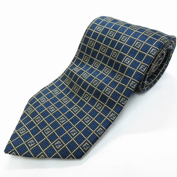 > #ae フェンディ FENDI ネクタイ 紺 茶系 格子柄 総柄 ズッカ柄 シルク イタリア製 メンズ [938584] k01