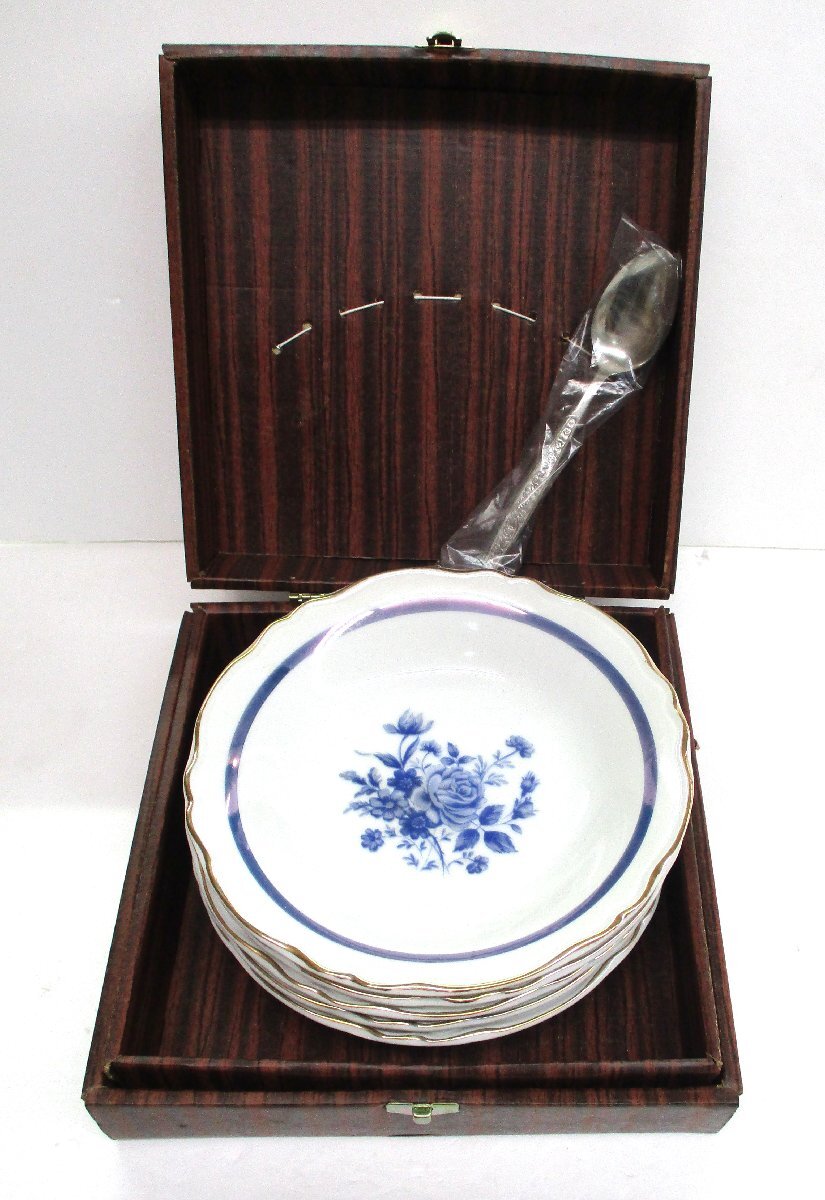 - カレー皿セット 有田焼 ローズ 5枚 里城 プレート 昭和レトロ ステンレススプーン付 直径20.5x高さ3.6cm 長期保管品 未使用 101901