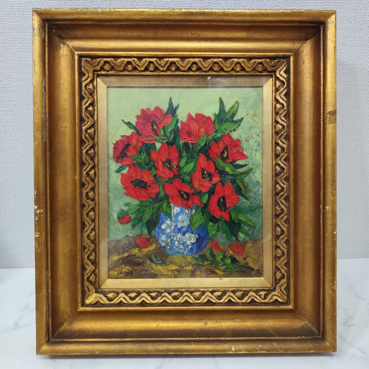 - 美術品 芸術 絵画 静物画 花瓶の赤い花 花 サイン インテリア 木製装飾額 アート 油彩 額装 額縁