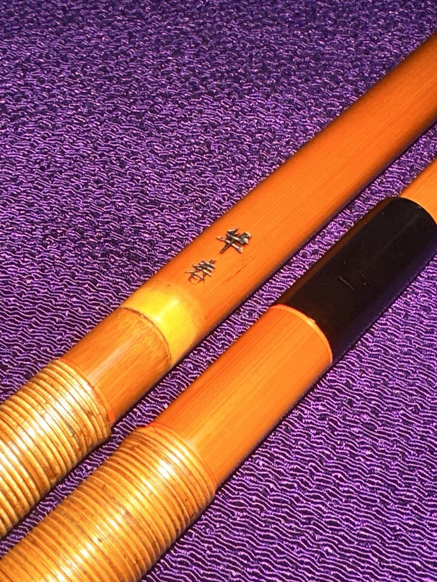 - 竿春時代の紀州へら竿創設者の一人 初代 源竿師 作 15尺、替元12尺 穂持ちと穂持ち下は高野竹 黒朱飾り線仕上げ口巻 5本継 籐巻握り