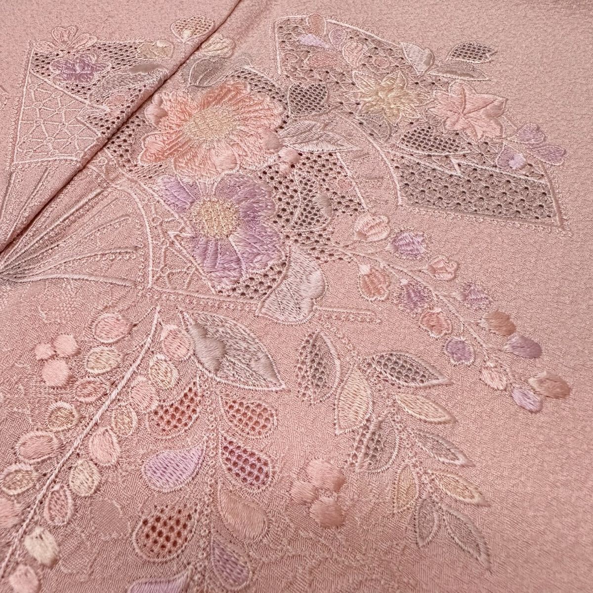 - 汕頭刺繍 付下げ 扇に花模様 着物 正絹 W-5576