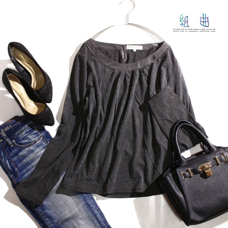 - 美品 組曲 クミキョク 株) オンワード樫山 合物 大きいサイズ6 ストレッチ Tシャツ 飾りラインストーン 長袖 カットソー チャコール グレー