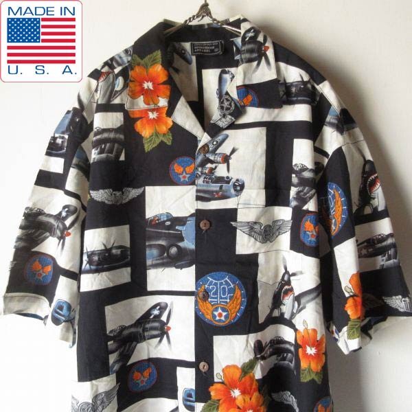 > USA製 エアフォース マーク 戦闘機 コットン 半袖 アロハ シャツ L 黒ベース ミリタリー 米軍 オマージュ アメリカ製 D151-04-0002ZVW