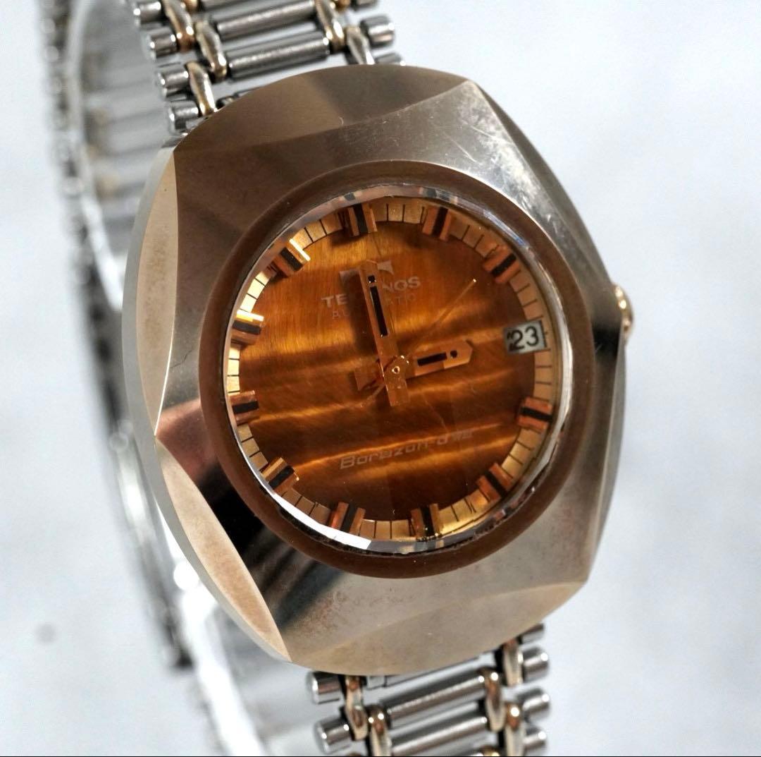 > 1円 スタート TECHNOS テクノス ボラゾン タイガーアイ カットガラス 稼働品 腕時計 自動巻き automatic vintage antique wacth 1スタ