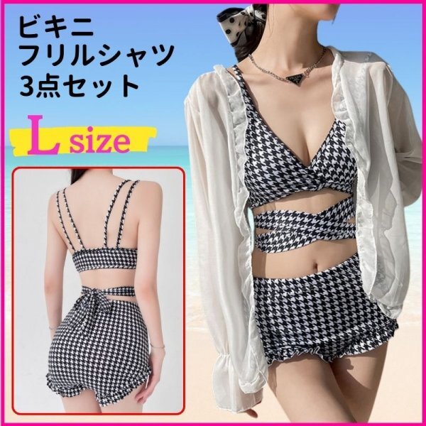 > レディース 水着 Lサイズ 3点セット 千鳥柄 ハイウエスト フリルカーディガン付 ビキニ 人気 韓国 体型カバー モノトーン セットアップ 〇