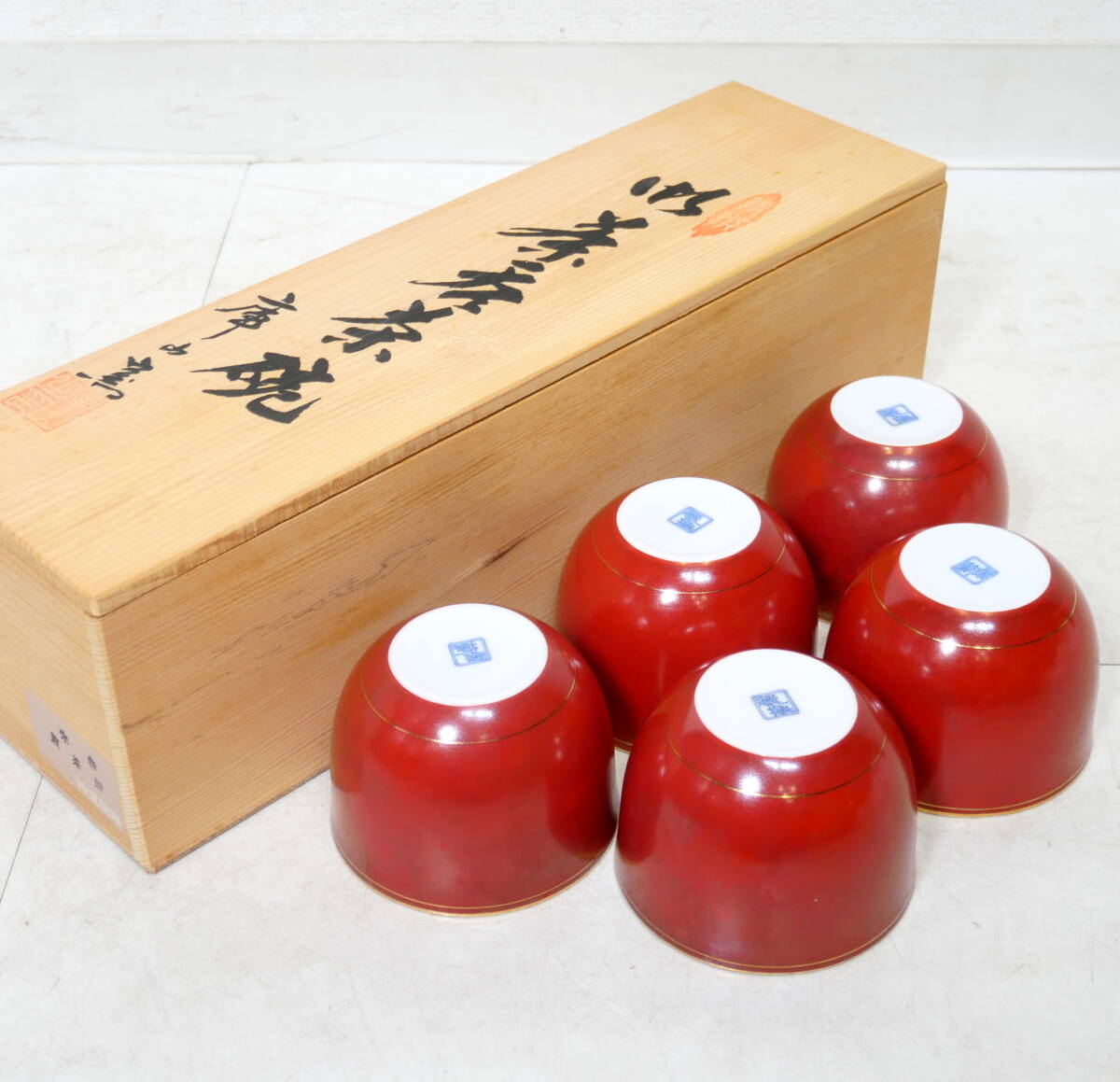 > ▲(R710-H219) 庫山窯 美濃焼 朱巻 煎茶揃 5客組 金彩 金縁 湯呑み 茶器 赤 レッド 特選陶器 前畑陶器 (約)直径8.3㎝×高さ6㎝ 共箱付き