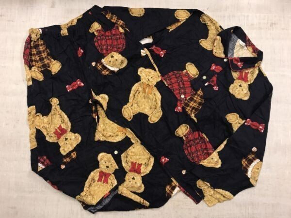 > G-HOUSE Pour femme トラッド テディベア 総柄 ロング丈 シャツ イージーパンツ ルームウェア上下セットアップ レディース L 黒