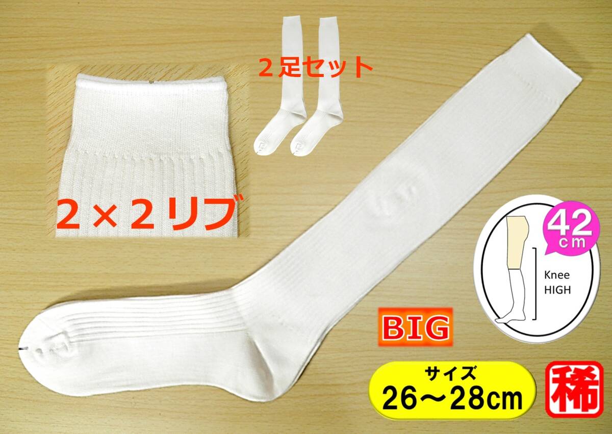 > 【レッグウェア★未使用品】送料込◆2足セット◆BIGサイズ◆2×2リブ◆白 リブ ハイソックス◆スクールソックス◆26-28cm◆42cm丈◆