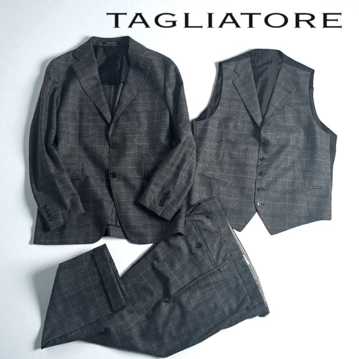 > 極美品 ★ TAGLIATORE タリアトーレ BEAMS別注 3ピース セットスーツ 48 チェック柄 イタリア製 ビジネス フォーマル 成人式