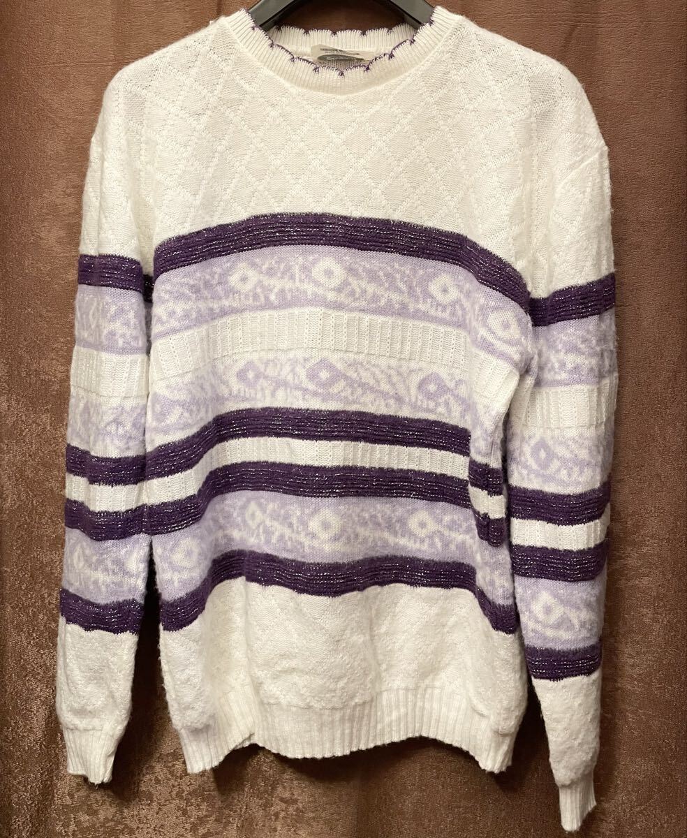 - MADE IN CANADA製 Elegant アクリルセーター ホワイト×パープル セーター ニット ボーダー柄 白 紫 カナダ製