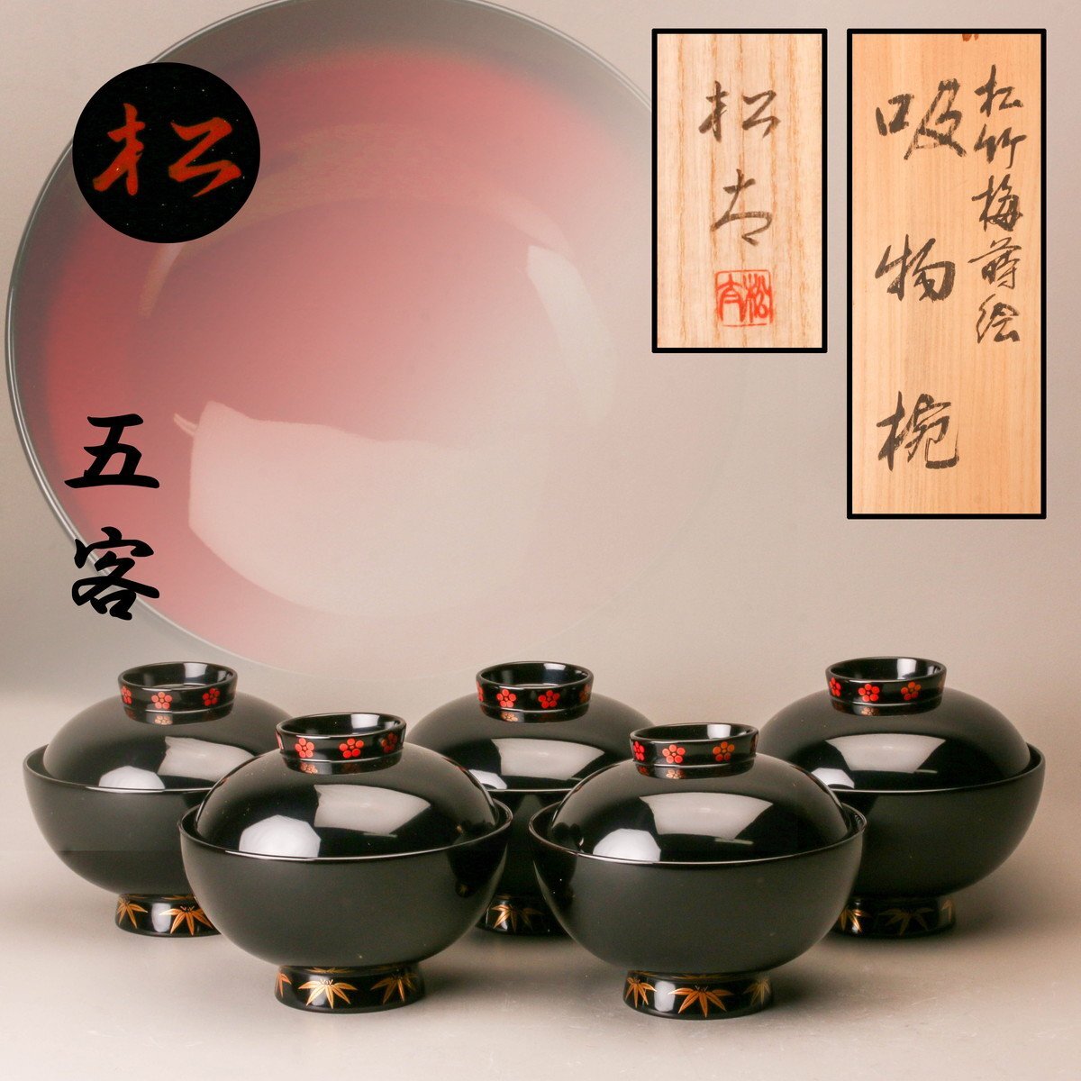 【SAG】松斎 松竹梅蒔絵吸物椀 五客 共箱 共布   本物保証