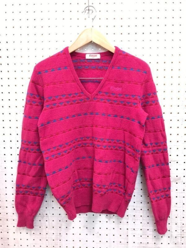 > レイクランド Lakeland ショッキングピンク オールド レトロ Vネック ロゴ刺繍 ジャガードボーダー ニット セーター レディース サイズM