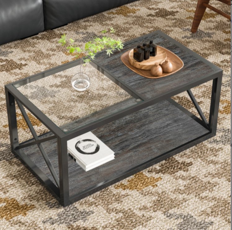 - 長方形コーヒーテーブル リビング用 強化ガラス天板×ウッド調MDF インダストリアルスタイル ローテーブル