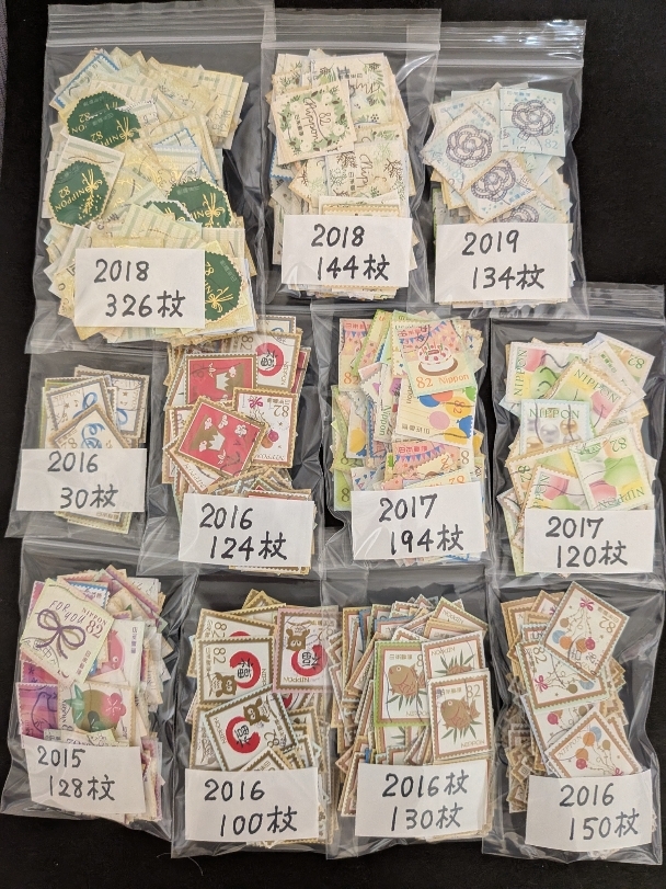 - 使用済み切手 「ハッピーグリーティング(2015~2019)」1580枚(台紙付)