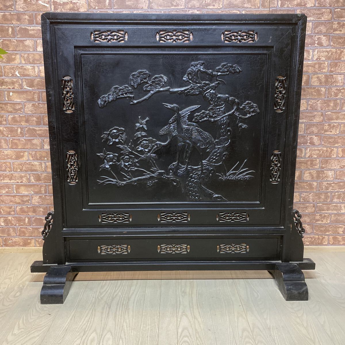- T4258 松 鶴 黒 屏風 木製 衝立 銘柄 彫刻 縁起物 古民家