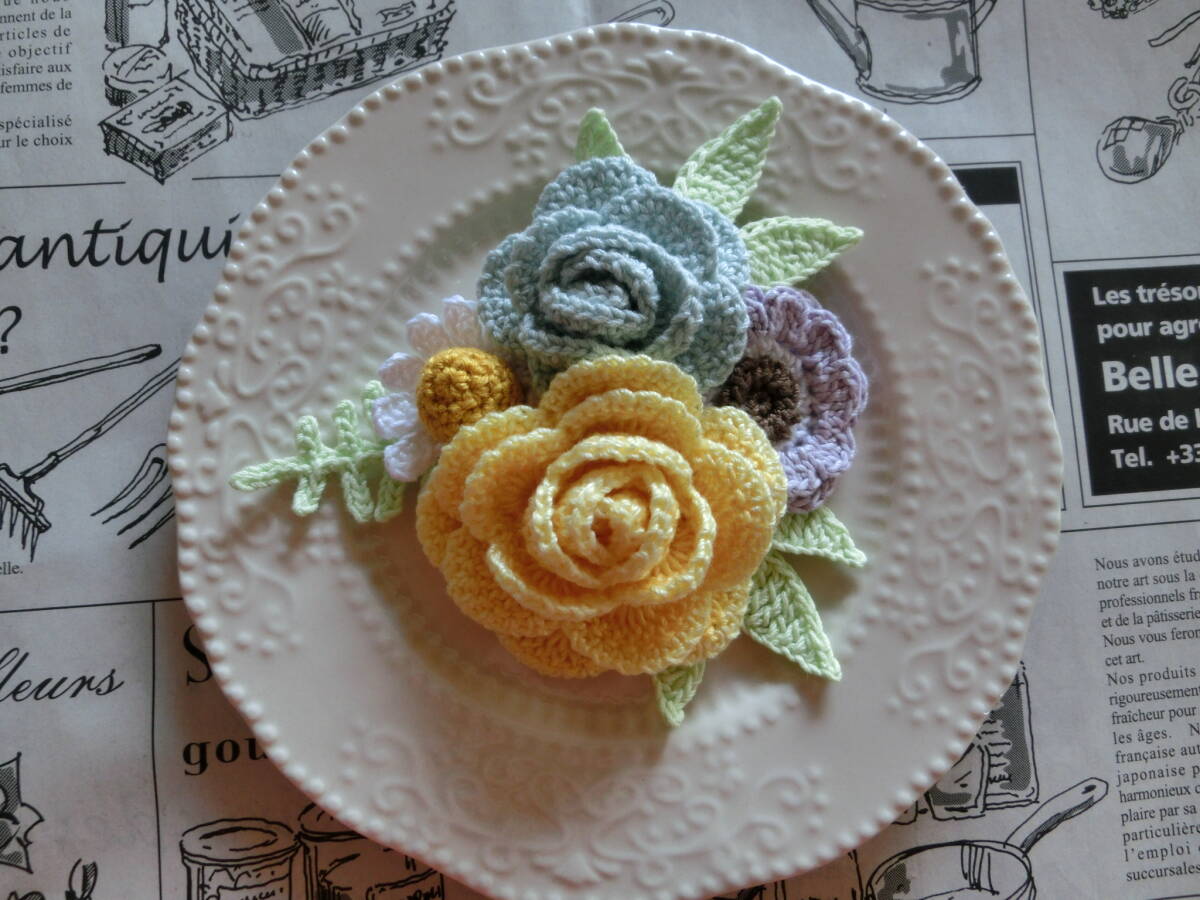 - ☆ 2489 薔薇と小花のブーケ 黄色系薔薇 クロシェレース コサージュ ハンドメイド