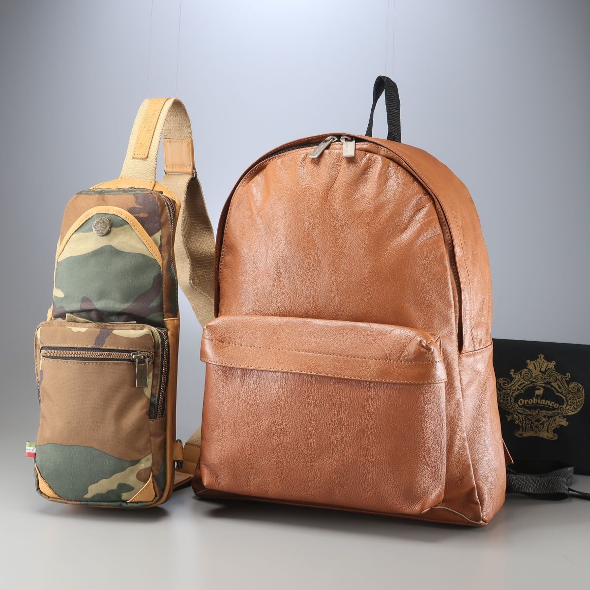 > MI1478◎Orobianco オロビアンコ バッグ 2点セット 迷彩柄×レザー ボディバッグ + A4サイズ対応 リュックサック デイパック 鞄 茶