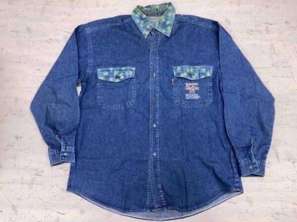 - 韓国製 GRAND PRIX shelltec スポーツ 花柄襟切替 ビッグシルエット レトロ オールド古着 長袖デニムシャツ メンズ 紺