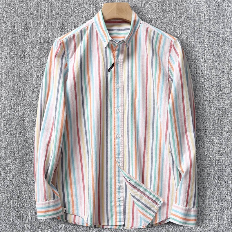 > 人気爆売!DCKMANY 新品 メンズ長袖シャツ 純綿 オックスフォード 春夏 レインボーストライプ柄 日常 カジュアル/T4026-L