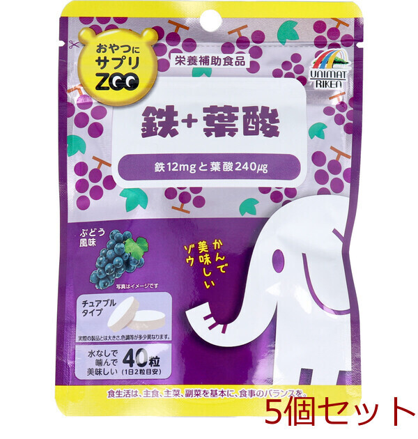 - おやつにサプリZOO 鉄+葉酸 チュアブルタイプ ぶどう風味 40粒 5セット