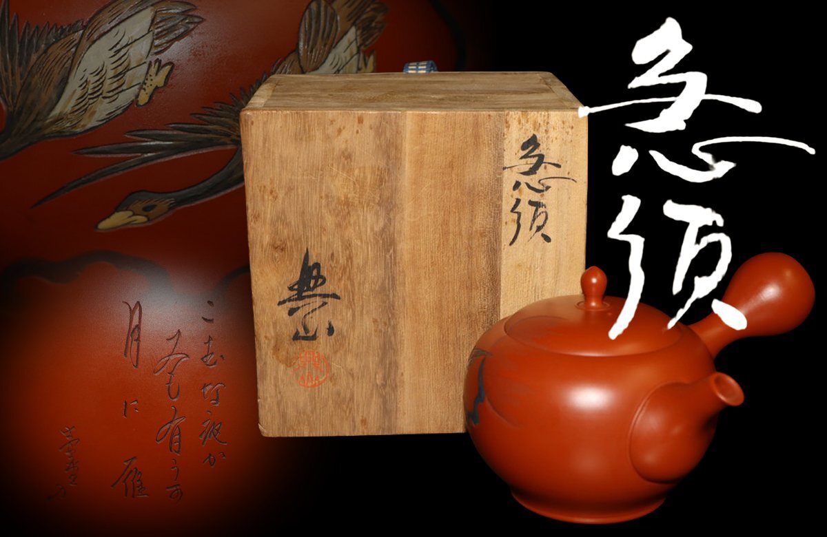 > 【江】常滑焼 吉川雪堂造 朱泥双雁俳句文横手急須 高さ8.5㎝ 在銘 木箱 古美術品(茶道具煎茶器急須土瓶)AX1809 CTDBjjhd