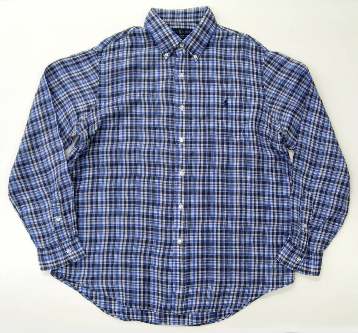 > ポロラルフローレン ブルーネイビーチェック リネン ボタンダウン長袖シャツ XLサイズ POLO 麻100% OCEAN WASH LINEN