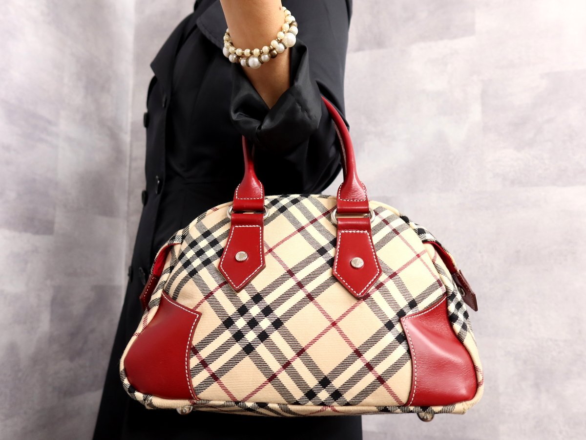 - ●超美品●バーバリー●ブルーレーベル●ノバチェック●キャンバス カーフ レザー 本革●ハンド バッグ●ベージュ 赤 黒●SV金具●Js62037