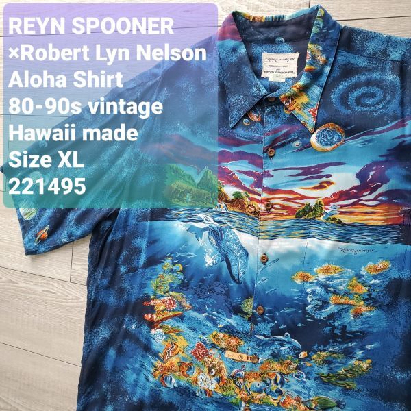 > REYNSPOONER×ROBERT LYN NELSON レインスプーナー USED 80-90s vintage USA ハワイ製 Two Worlds 総柄 マリンアート 半袖 アロハシャツ XL