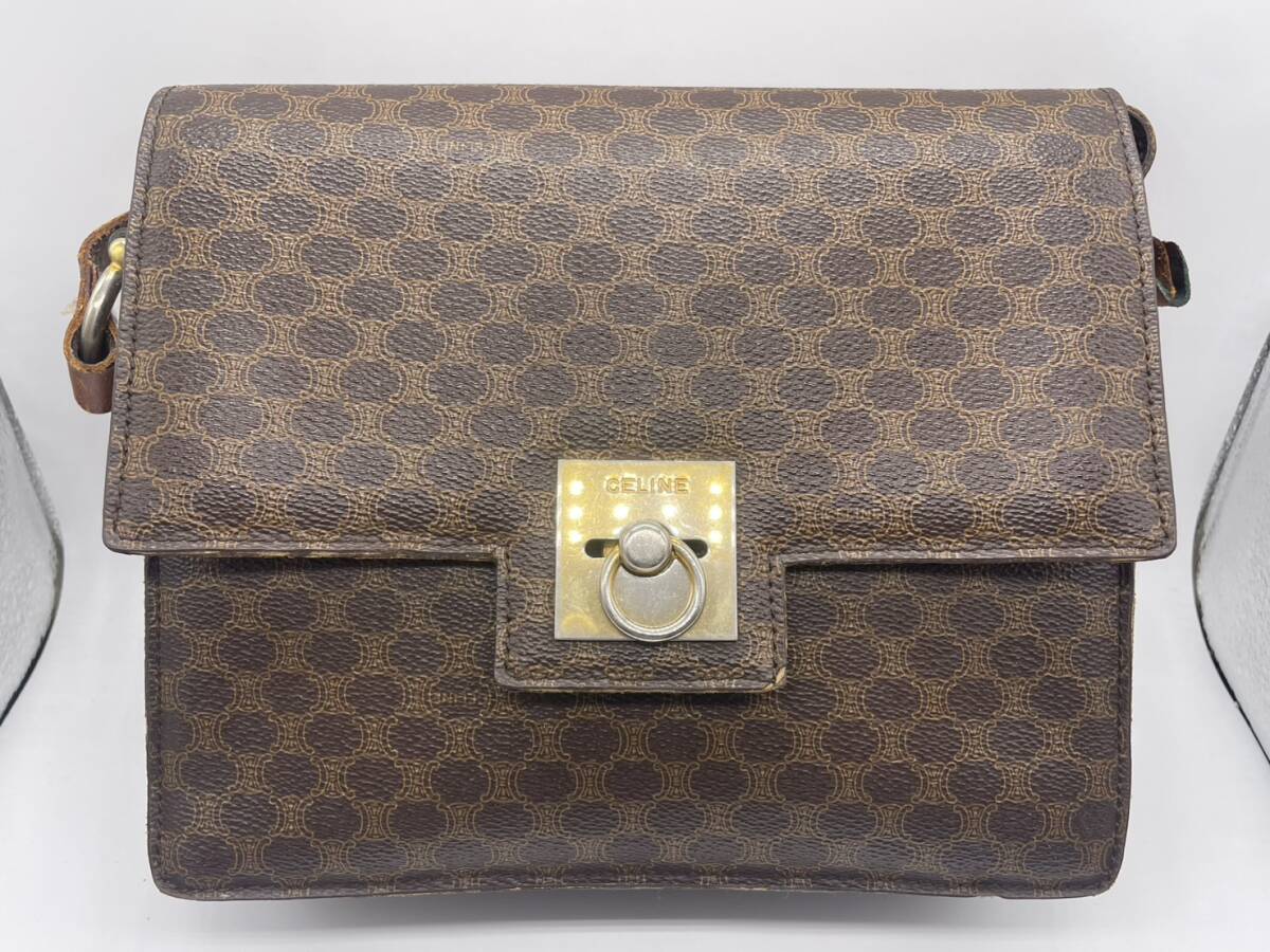 - 【現状品】 CELINE セリーヌ マカダム柄 PVC カーフ レザー 本革 ショルダー バッグ ブラウン ゴールド金具 ガンチーニ フラップ ジャンク