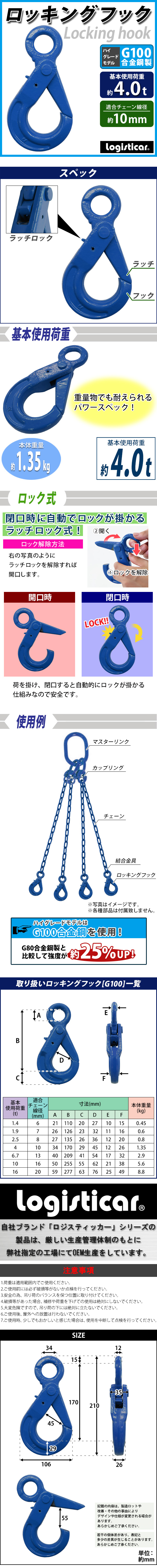 - 送料無料 ロッキングフック 使用荷重約4t 約4000kg G100 鍛造 ハイグレードモデル フック 固定式 吊り具 ロックフック セルフロッキング