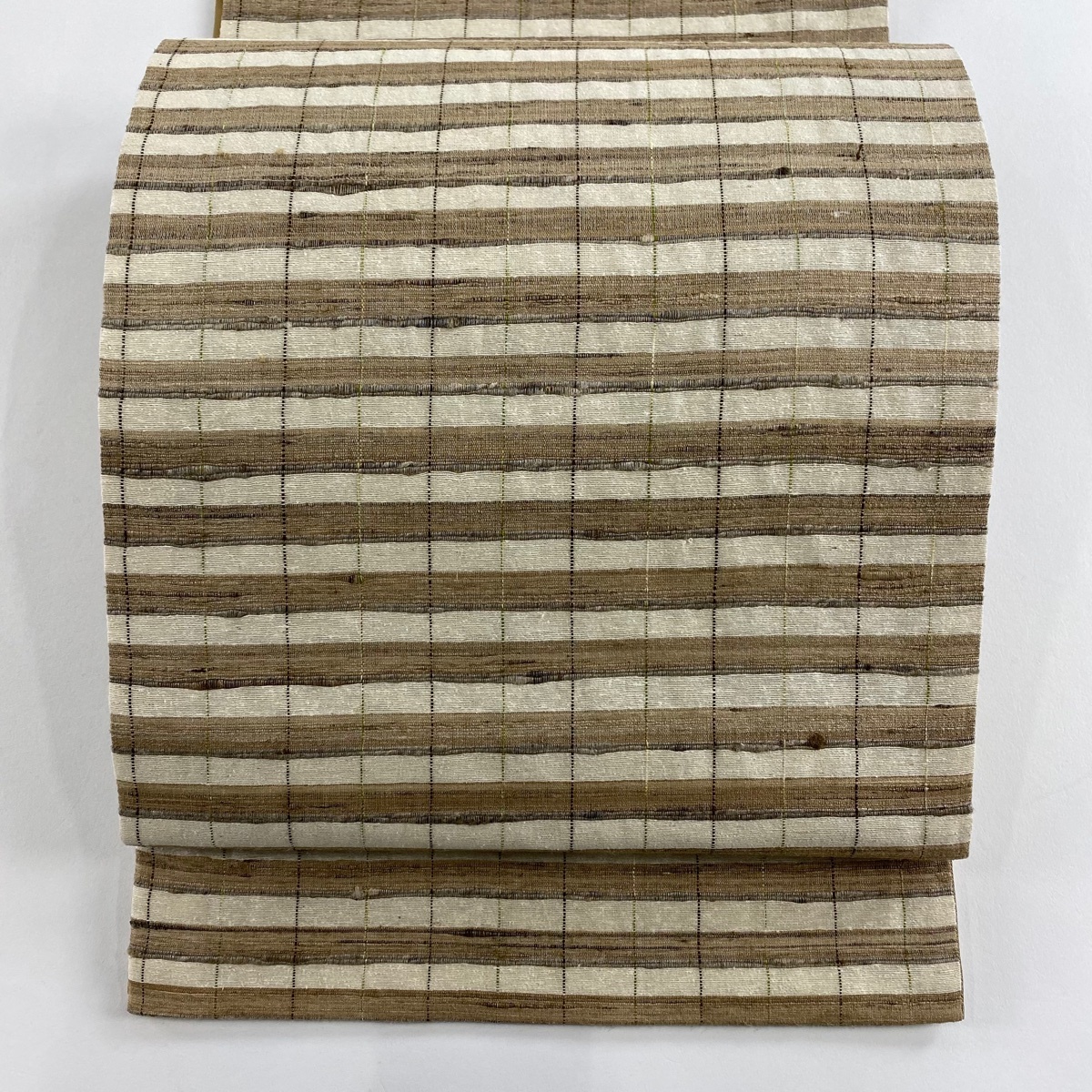 - 【美品】 袋帯 逸品 証紙 野蚕シルク 縞 灰茶 全通 正絹 【中古】