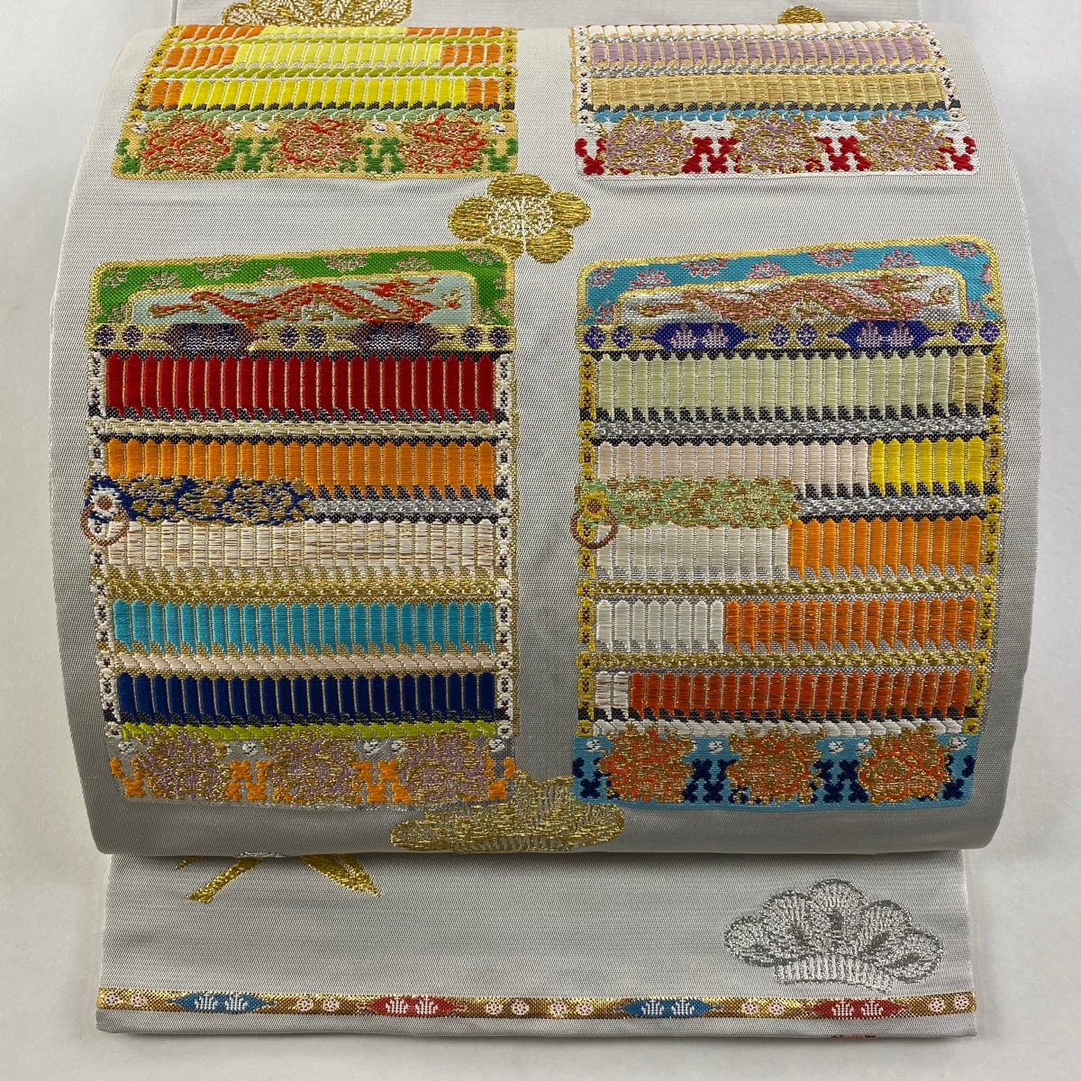 - 【美品】 袋帯 逸品 落款 龍村光翔 本袋 関西仕立て 鎧縅 松竹梅 金銀糸 箔 灰白 お太鼓柄 正絹 【中古】