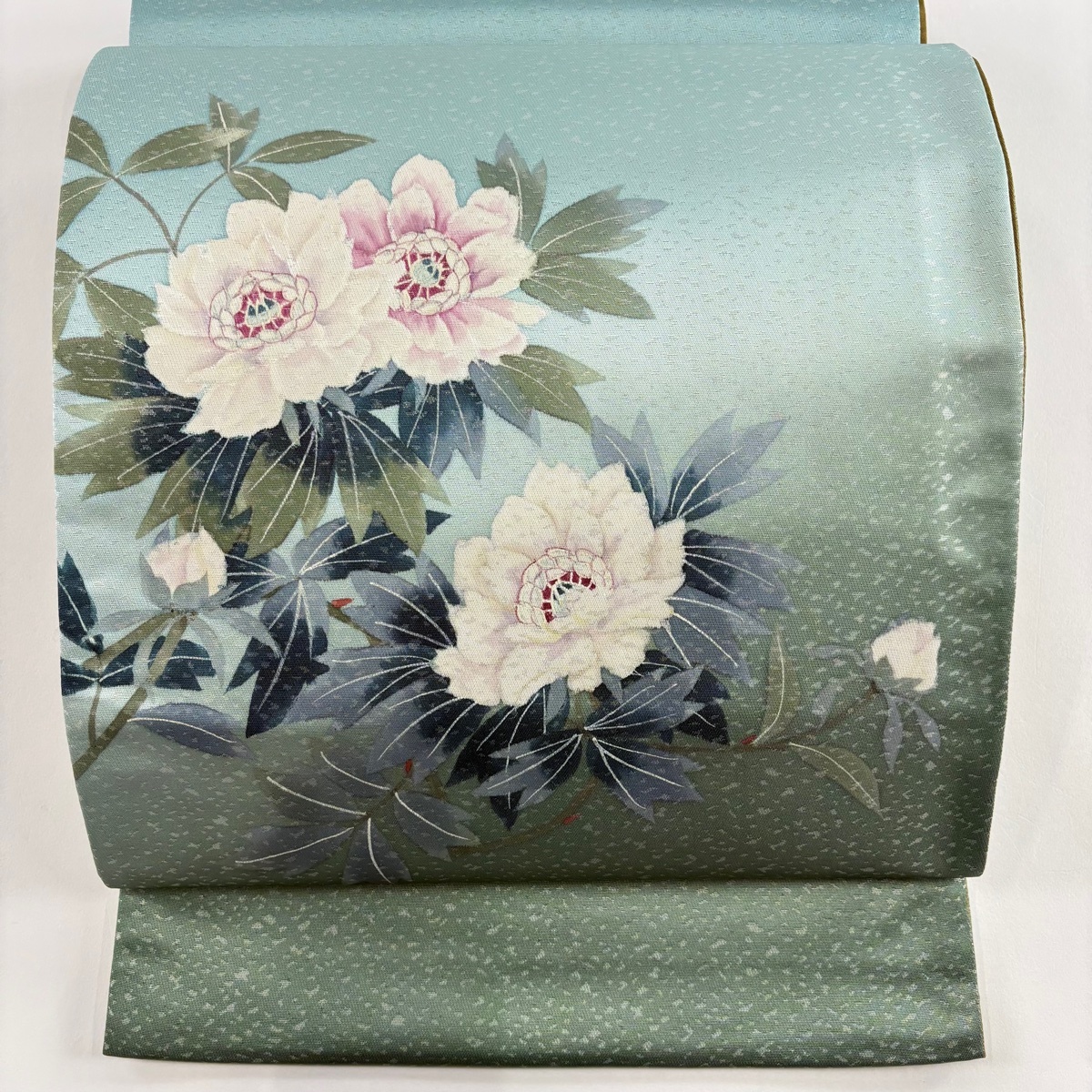 - 袋帯 秀品 二代目清次郎 落款 草花 幾何学 箔 灰緑 お太鼓柄 正絹 【中古】