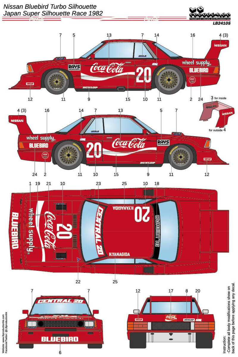 > 24105 1/24サイズ LB PRODUCTION 製シルクスクリーンデカール Nissan ブルーバード・ターボ シルエット Japanシルエットレース 1982