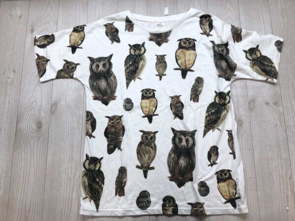 > ジムマスター gym master アメカジ アウトドア 手描き アート ミミズク フクロウ 動物柄 総柄 半袖Tシャツ メンズ コットン混合 L 白