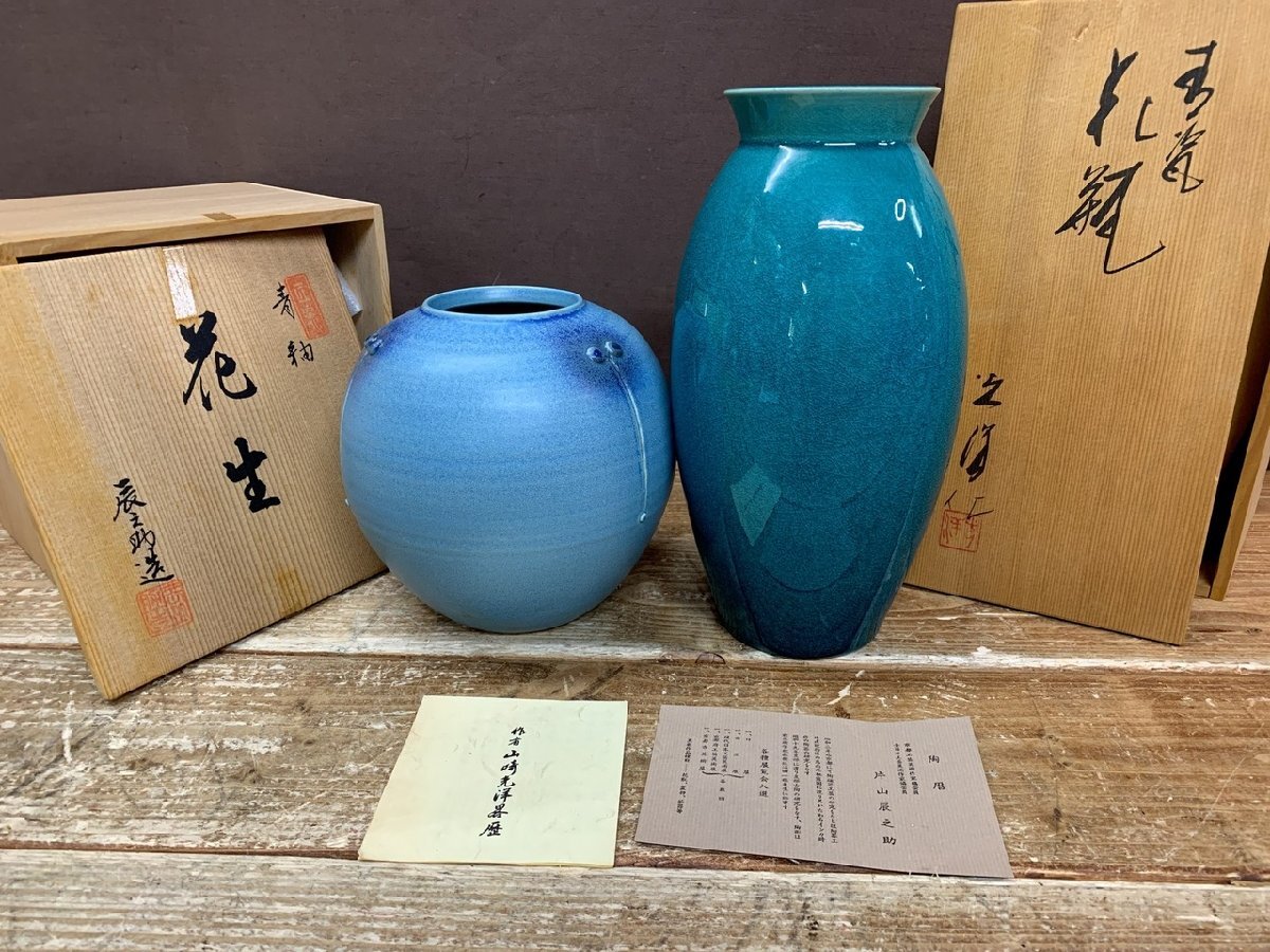 - 【YB-2807】花器 花瓶 セット 京焼 山崎光洋作 青磁 清水焼 片山辰之助造 青釉 花生 花瓶 花道具 華道具 茶道具 東京引取可【千円市場】