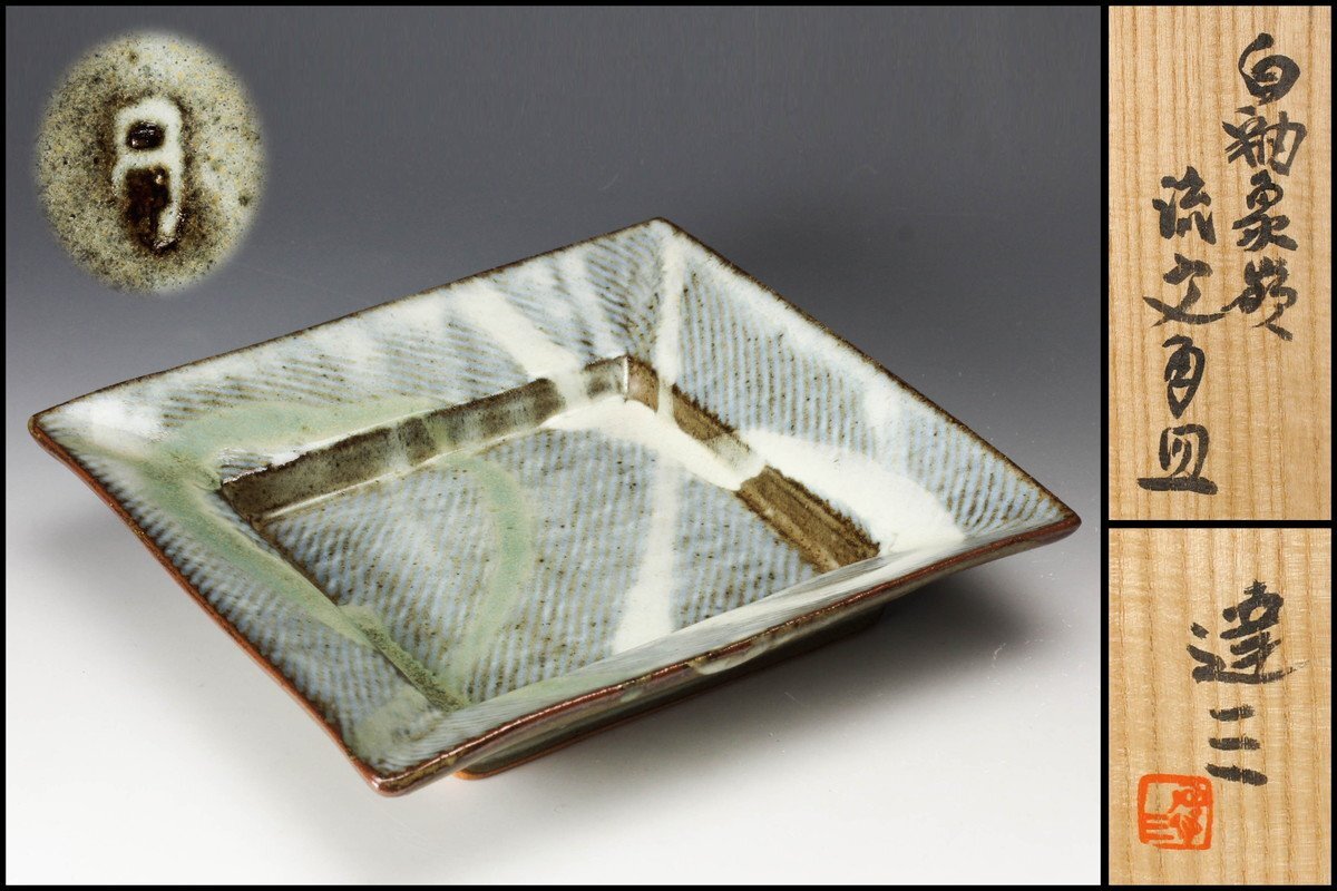 【佳香】人間国宝 島岡達三 白釉象嵌流文角皿 共箱 栞 本物保証